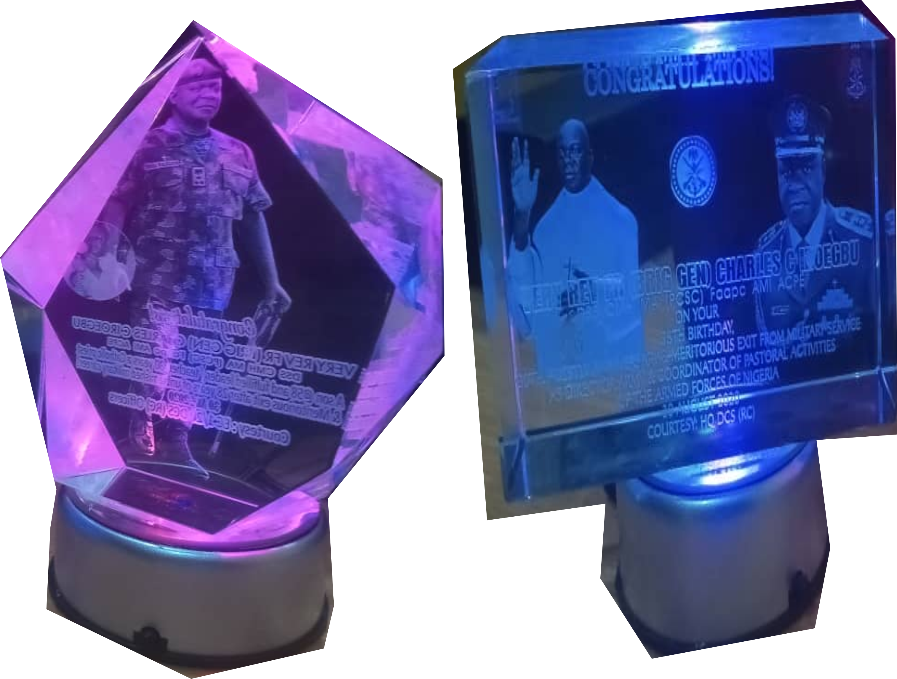 The climax of the occasion was the presentation of award plaque to Father Iroegbu, the celebrant. 3D crystal award of honour presente to him is the highest category in the class of plaque award memento. The printing is ultra-violent that directly transferred the pictures of the Reverend Father and Army Officer as well as the wordings right inside the 3D crystal. This is just to make sure that both the 3D crystal award of honour plaque and the wordings remain ever green.