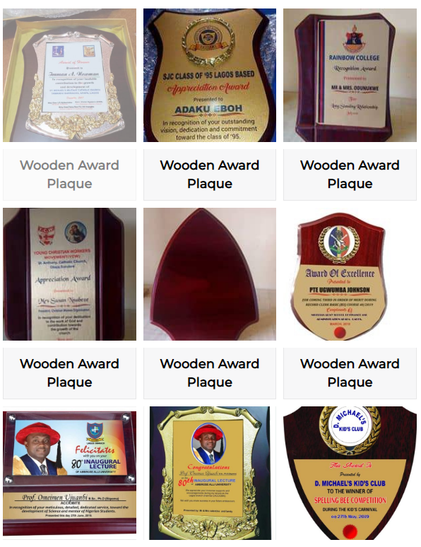 Award plaques have various types, designs and shape. There are wooden award plaques in Lagos, which as the name suggests are made of wood. Wooden plaques are of different sizes and designs. In fact any size is possible but the most come ones are the 6 by 8 in inches, 8 by 10 in inches. And also 9 by 12 inches wooden award plaques. Others are 12 by 15 inches wood as well as 16 by 20 inches wooden plaque